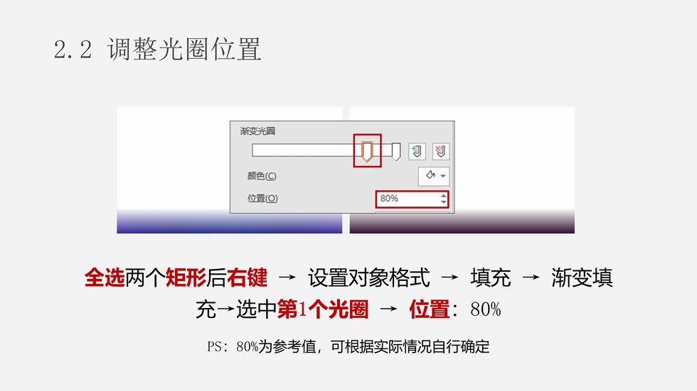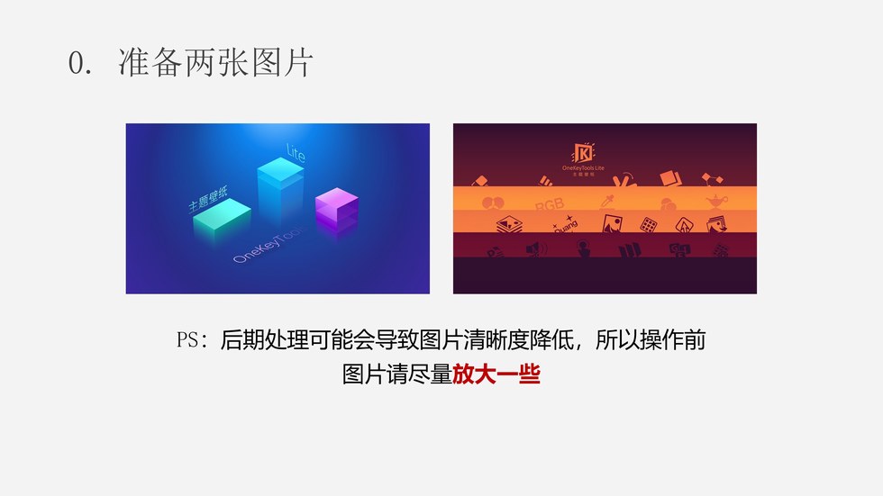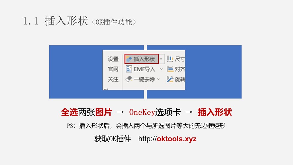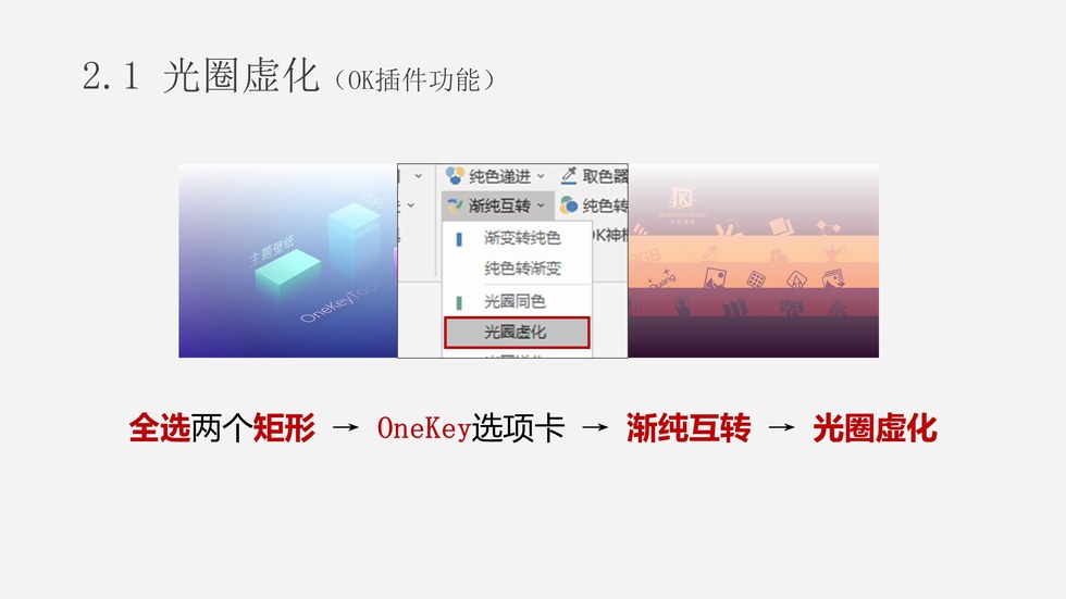 :PPT多图融合拼接技术:0. 准备两张图片;1.1 插入形状(OK插件功能);1.2 修改矩形填充为白色;2.1 光圈虚化;2.2 调整光圈位置;2.3 调整光圈角度;3.1 正片叠底;3.2 删除原图;3.3 拼接新图。