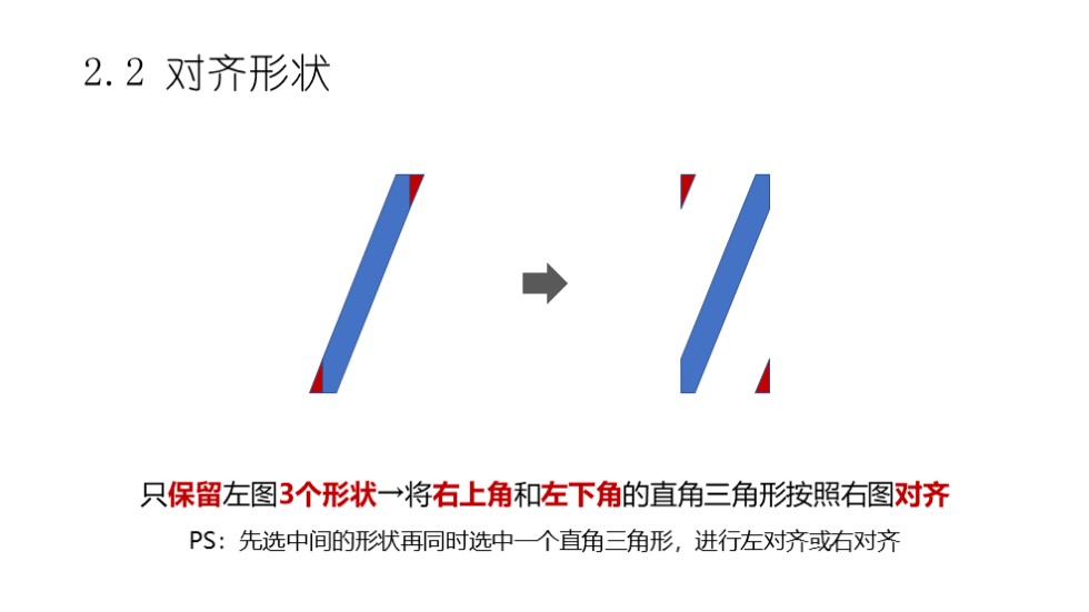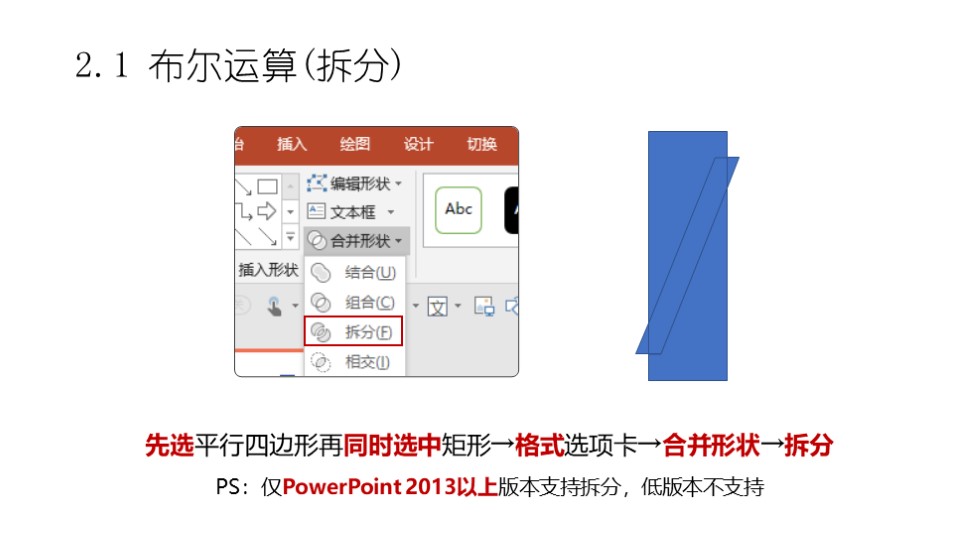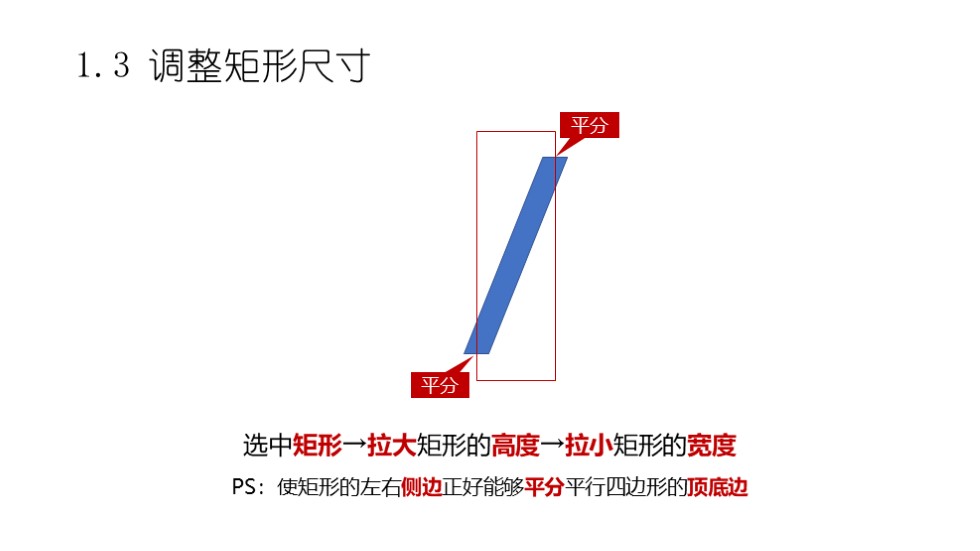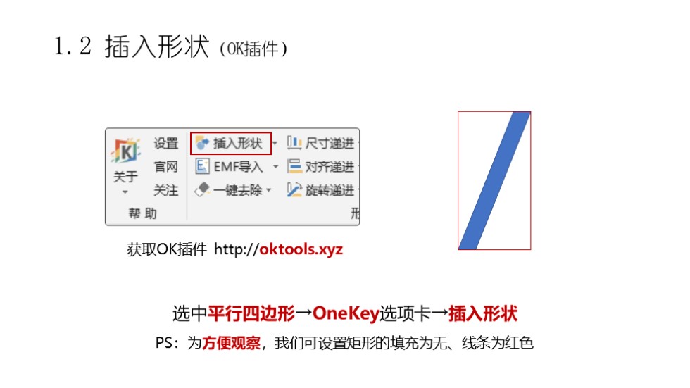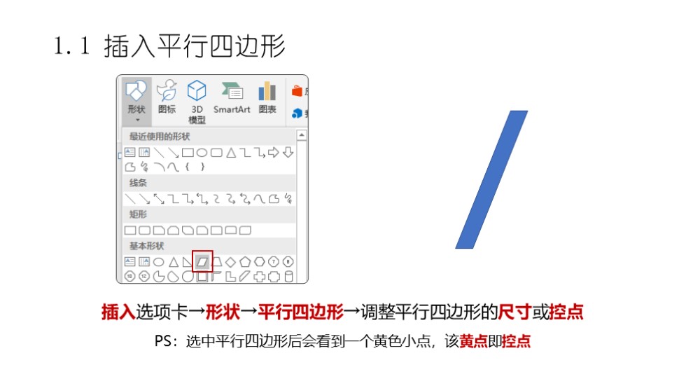 :PPT斜线纹理教程:1.1 插入平行四边形:插入选项卡→形状→平行四边形→调整平行四边形的尺寸或控点;1.2 插入形状(OK插件);1.3 调整矩形尺寸;2.1 布尔运算(拆分);2.2 对齐形状;2.3 去掉形状的边框;3.1 组合并填充到形状;3.2 将图片平铺为纹理;扩展:纹理填充的更多设置。