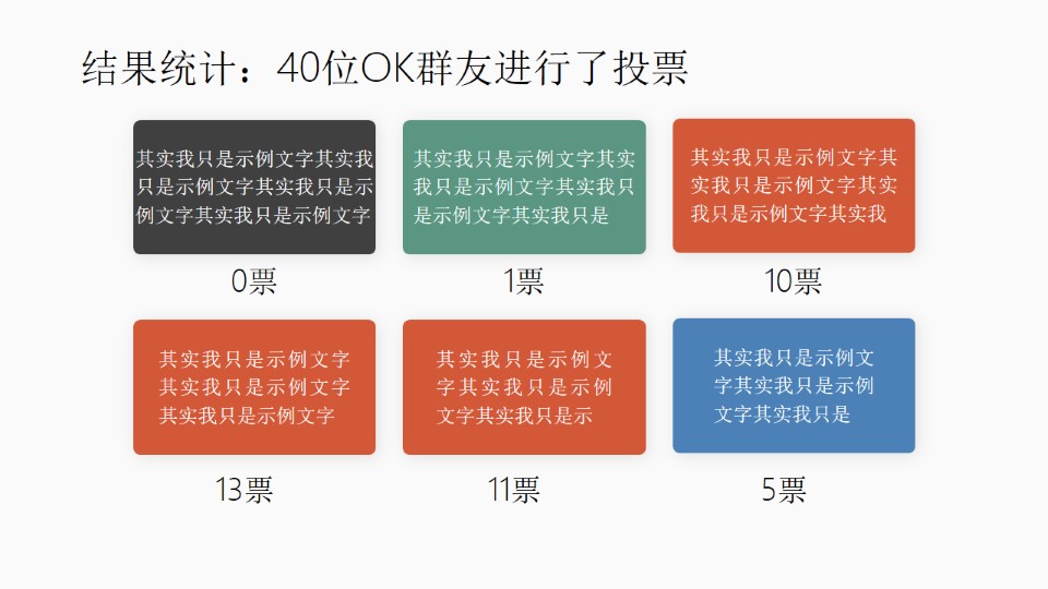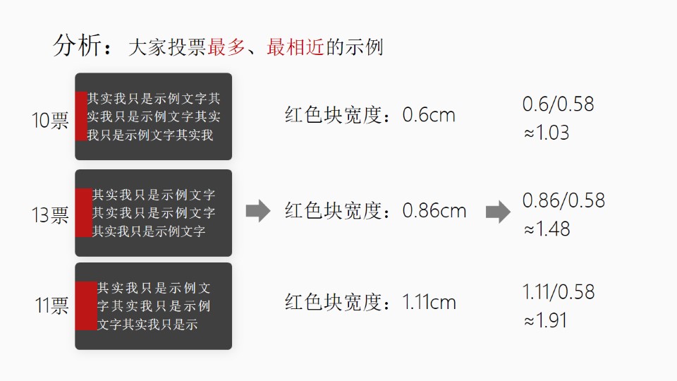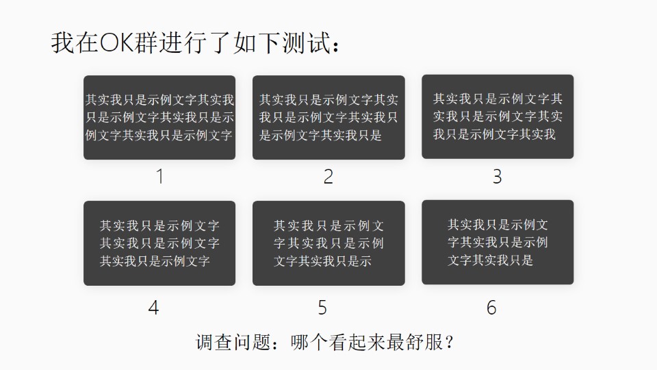 :PPT排版原理探究(二):我在OK群进行了如下测试:调查问题:哪个看起来最舒服?结果统计:40位OK群友进行了投票,分析:我们先来确定一个基准尺寸,分析:大家投票最少的示例,分析:大家投票最多、最相近的示例,猜想推论,猜想推论,文本框的边距是文字尺寸的1-2倍时效果比较好,也就是:边距中最好能塞入1-2个文字。