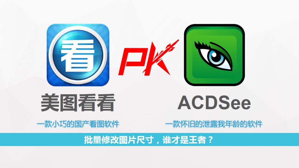 :批量改尺寸谁更强,工欲善其事,必先利其器,天下武功唯快不破,天下工作效率优先,商业进程中,没有模式,只有效率。效率如何高?技能再好,不如好的工具!美图看看(一款小巧的国产看图软件)PKACDSee(一款怀旧的泄露我年龄的软件),批量修改图片尺寸,谁才是王者?