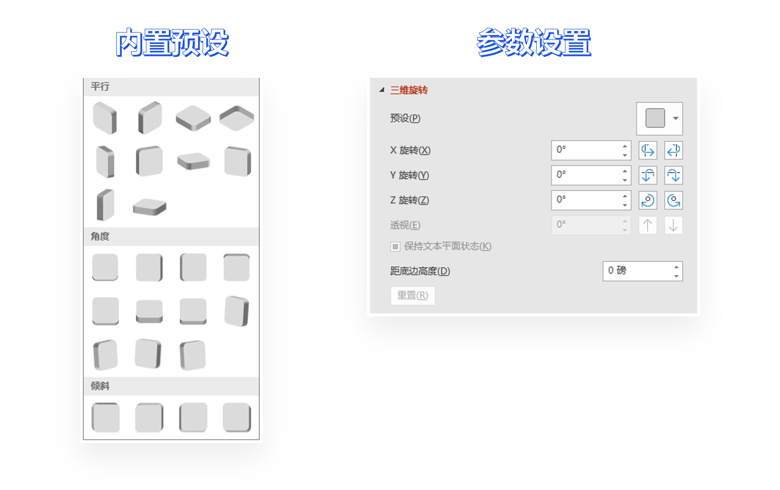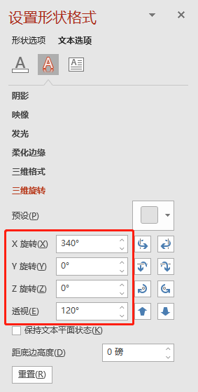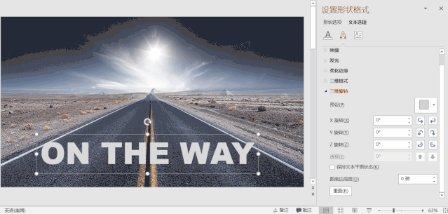 ▎步骤一:选中文本框-右键-【设置形状格式】-【文本选项】-选择【文字效果】 中的【三维旋转】,选择跟图片相同的透视角度。这里我们选择【透视:右】。