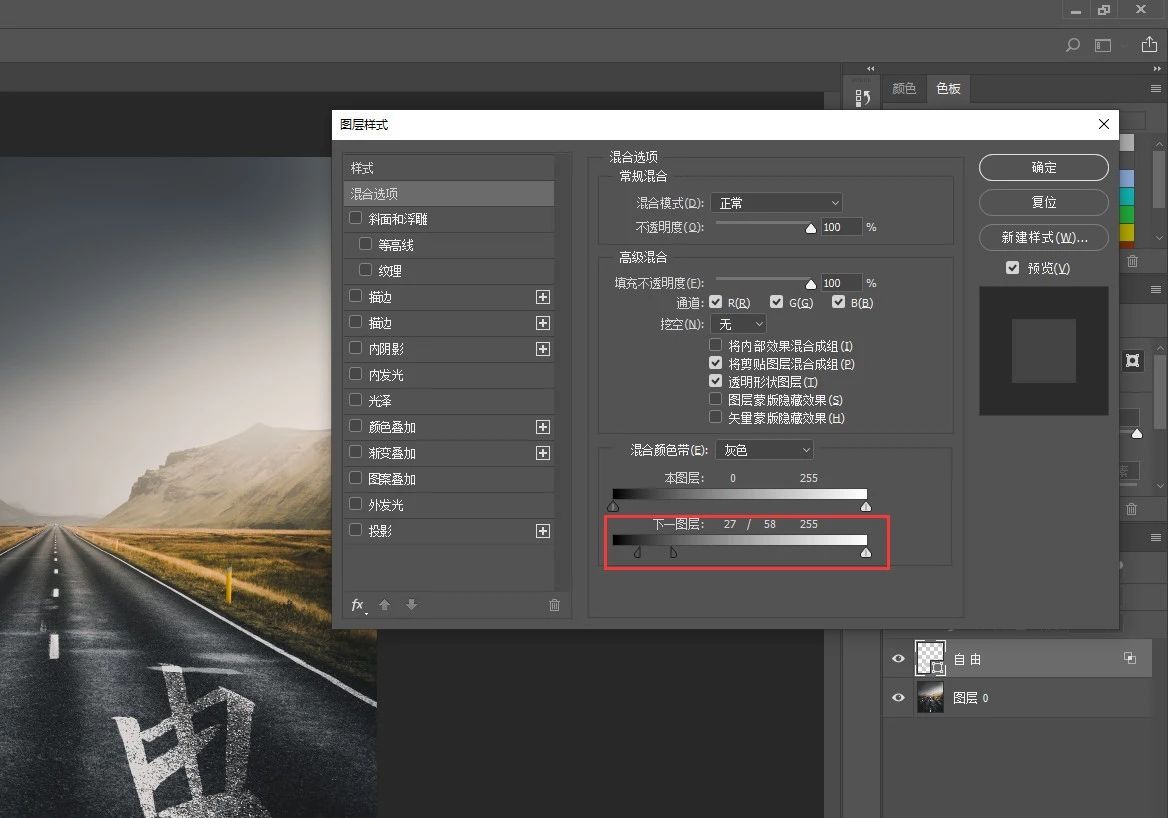在文字的图层上点击右键-找到【混合选项】,在混合颜色带的下一图层中,按住Alt键,拖动游标,让文字更加融入路面