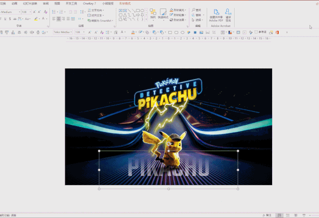 ▎步骤:选中文字-【形状格式】-【文本效果】-【转换】-选择【梯形】,根据实际情况调整文本框的位置,调整小黄点,把文字聚焦在皮卡丘的脚下