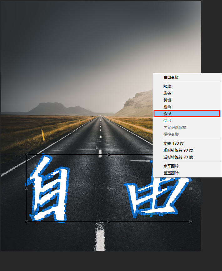 快捷键【Ctrl+T】将它变大,并适当地压扁一些,毕竟我们要让它写在路面上~
