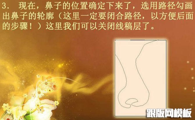 3、现在鼻子的位置确定下来了,选择钢笔工具勾出鼻子的轮廓(这里一定要闭合路径,以方便以后的步骤),这里我们可以关闭线稿层了。