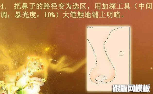 4、把鼻子的路径变为选区,用加深工具(中间调;曝光度:10%),用大笔触铺上明暗。