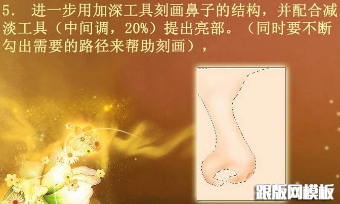 5、进一步用加深工具刻画鼻子的结果,并配合减淡工具(中间调,20%)提出亮部。(同时要不断勾出需要的路径来帮助刻画)。