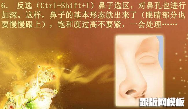 6、按Ctrl + Shift + I 反选鼻子选区,对鼻孔也进行加深。这样,鼻子的基本形态就出来了(眼睛部分也要慢慢跟上),饱和度过高不要紧,一会处理。
