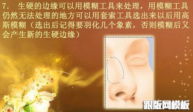 7、生硬的边缘可以用模糊工具来处理,用模糊工具依然无法处理的地方可以用套索工具选出来以后,用高斯模糊(选出后记得要羽化几个像素,否则模糊后又会产生新的生硬边缘)。