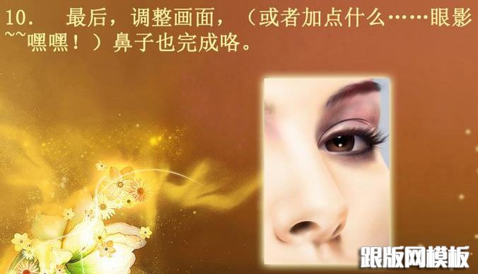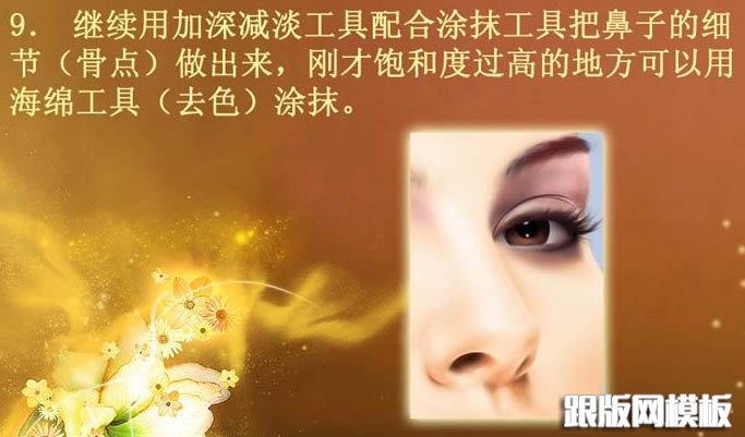 9、继续用加深,减淡工具配合涂抹工具把鼻子的细节(骨头)做出来,刚才饱和度过高的地方可以用海绵工具涂抹。
