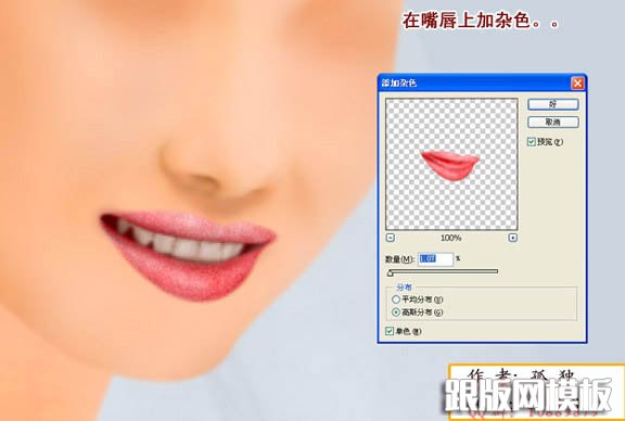 7、在嘴唇上加点杂色(滤镜 > 杂色 > 添加杂色)。