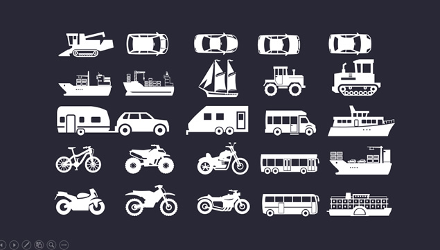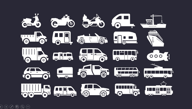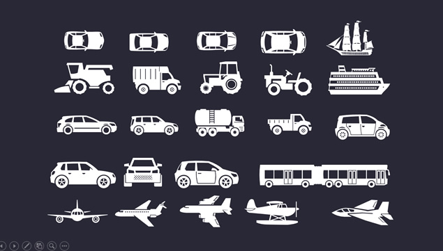 :汽车、轮船、帆船、拖拉机、推土机、挖掘机、房车、自行车、摩托车、公交车、电车、大巴、飞艇、吊车、拉土车、运输机、客机、小型飞机、水上飞机等100多种可以自行调整填充颜色的纯白色车类相关ppt图标素材打包下载。