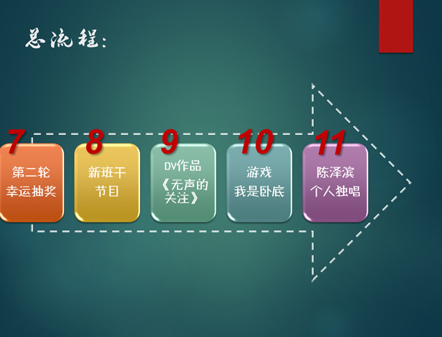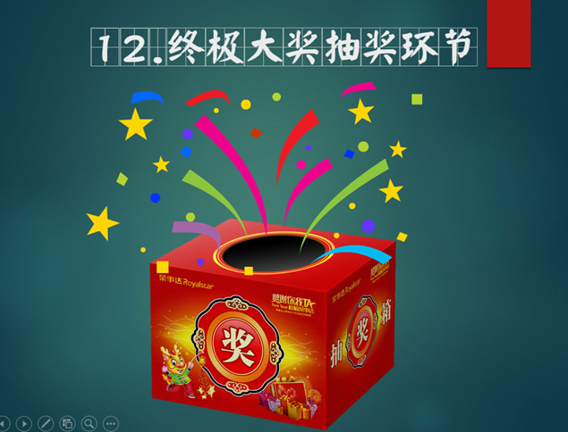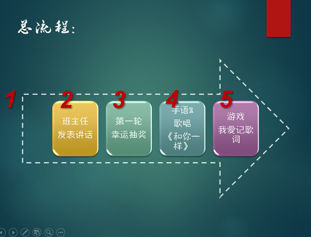 简介:我的中国梦班级主题活动,活动流程,班主任讲话,第一轮辛运大抽奖(点击开始暂停按钮抽奖),歌曲,游戏,大学生班级活动主题ppt模板。标签:中国梦,班级活动。